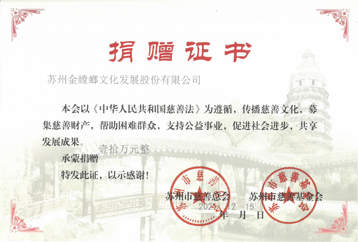 金螳螂文化在行動 傳播慈善文化,幫助困難群眾,支持公益事業,促進社會進步,共享發展成果。點滴善行匯聚江海,盡綿薄之力,擔社會責任。 愛心傳遞 Charity ??? 贈人玫瑰,手留余香 ??部分證書 01 青山綠水就是金山銀山,保護地球從我們做起。近日,蘇州金螳螂文化發展股份有限公司向蘇州市慈善基金會捐贈10萬元,用于支持蘇州市垃圾分類與環保公益項目“零碳家園公益基金”。 02 讓善意的種子生根發芽,金螳螂文化每年組織員工愛心捐款。2021年籌集善款16.83萬元,全額捐贈給金螳螂公益慈善基金會,助力慈善事業的發展。 03 金螳螂文化工會每年開展困難職工幫扶和走訪、慰問,幫助有需求的伙伴走出困境,面向更好的生活。 在金螳螂文化這個平臺,我們同頻共振,攜手成長。公司對在職員工實行就餐補貼、節日福利、生日紅包、免費體檢、走訪慰問等;對項目一線員工夏送清涼、冬送溫暖;同時開展豐富多彩的團建拓展、考察交流活動,以健全的員工福利制度,力求打造幸福企業。 04 多年來,金螳螂文化重視校企合作以及創新研發,與上海大學、上海工程技術大學、蘇州大學、西交利物浦大學、南京藝術學院等院校建立了深度的產業研合作。 國際博物館協會國際博物館研究與交流中心(ICOM-IMREC)揭牌,金螳螂文化作為“上海大學教育發展基金會·國際文博教育基金”捐贈企業之一,積極支持文博產業發展。 1:“上海大學教育發展基金會·國際文博教育基金”捐贈 2:“室內設計6+”聯合畢業設計(實驗組) 3:與西交利物浦大學達成戰略合作 4:“姑蘇八點半 夜享悅高新”沉浸式產業研討會 5:與上海工程技術大學中韓多媒體設計學院合作簽約 6:與南京藝術學院進行校企合作洽談 凝聚慈善力量,履行企業社會責任。金螳螂文化將持續投身公益事業,以責任之心助力事業發展,真誠回饋社會,身體力行為社會創造更大的價值。