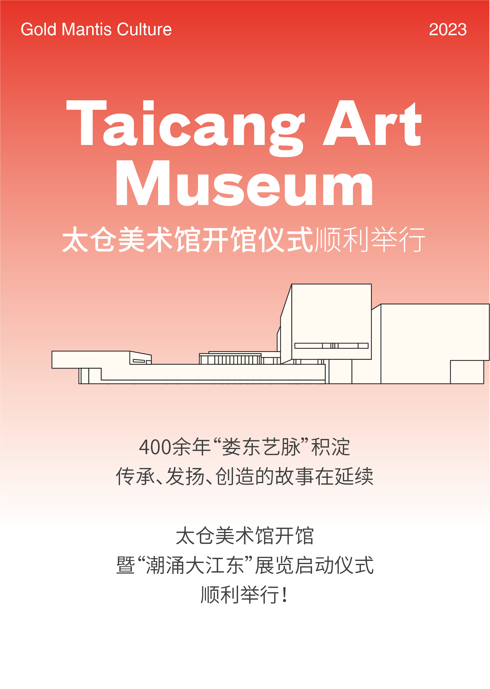 金螳螂文化有幸參與“潮涌大江東——太倉(cāng)美術(shù)館開(kāi)館展”的建設(shè),以專業(yè)的項(xiàng)目設(shè)計(jì)實(shí)施助力太倉(cāng)美術(shù)館順利開(kāi)館,以敬業(yè)的精神持續(xù)探索文化展示行業(yè),愿做文化與藝術(shù)的傳播者。
