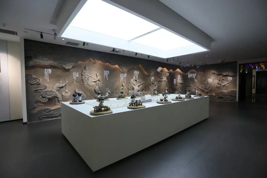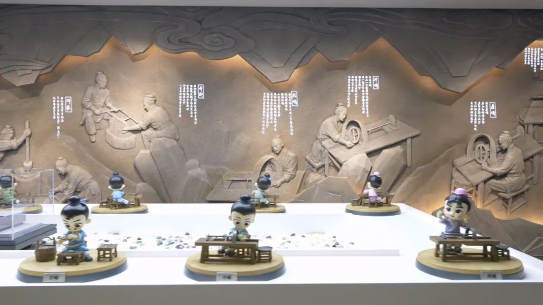 中心桌上打造IP卡通人物模型古代水晶雕刻技藝十二圖技法展演,刻畫了雕琢匠人操作的場面并備注操作說明,可以通過VR眼鏡看到動(dòng)態(tài)的雕琢場景,體現(xiàn)講習(xí)互動(dòng)、展示體驗(yàn)等非遺傳承功能。